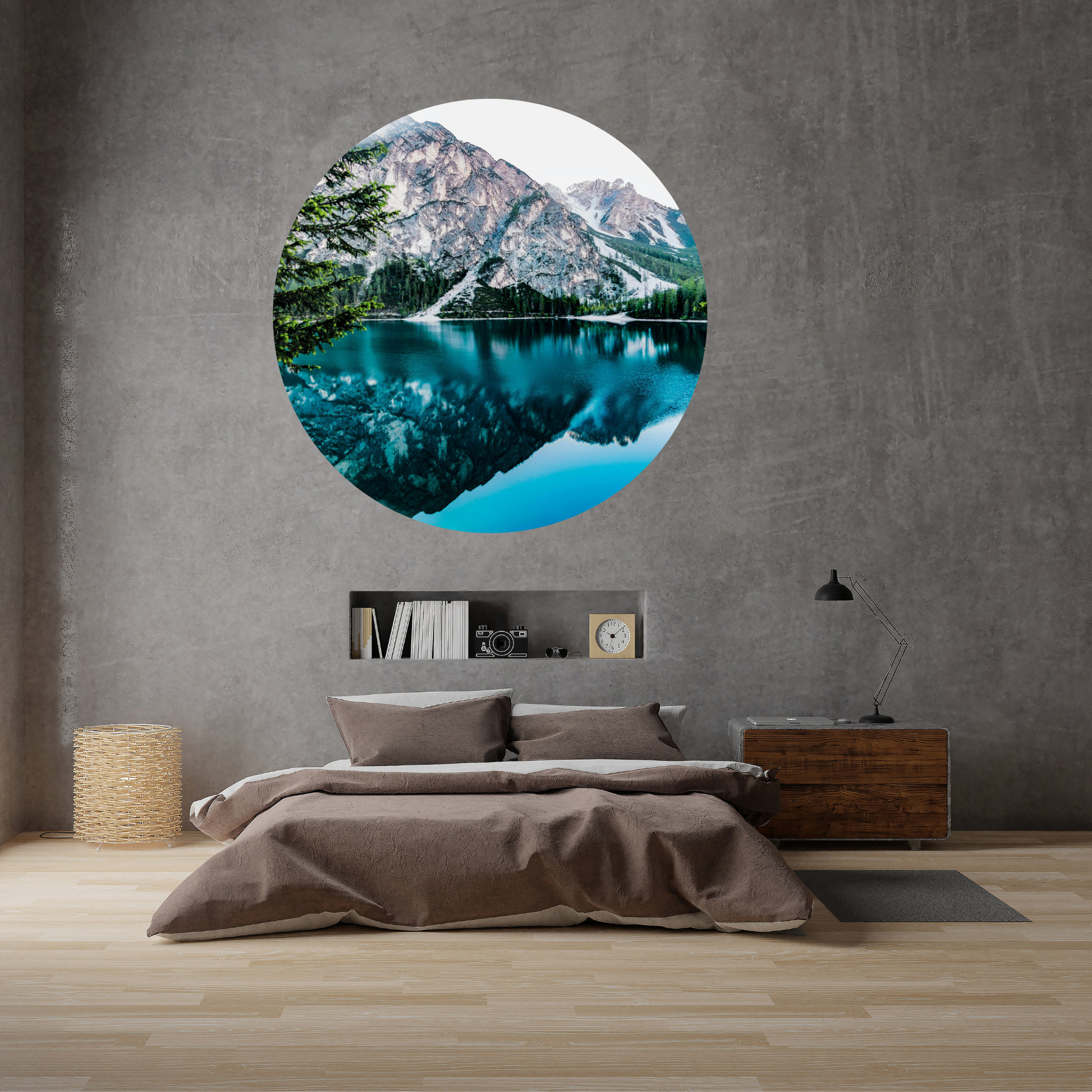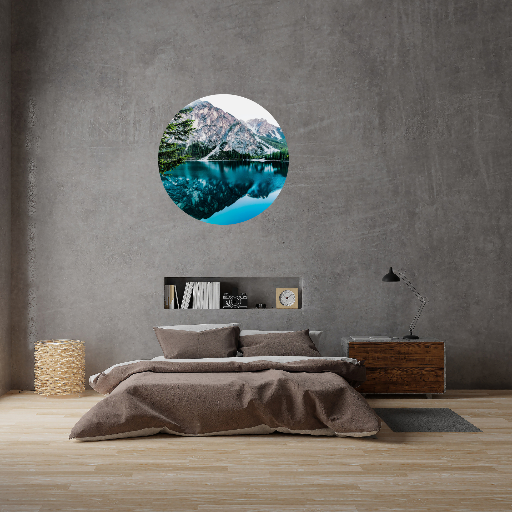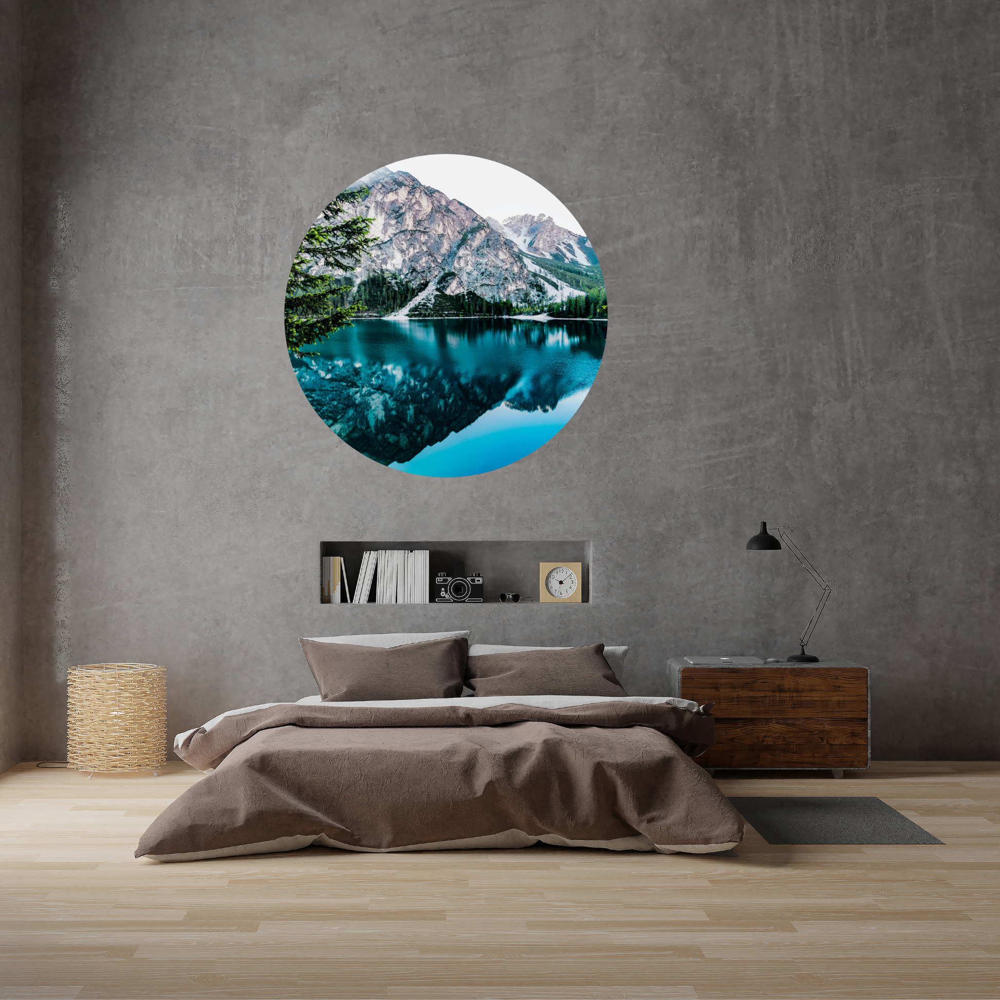 Add a touch of nature to your interior with our Textile Round Wall Sticker – “Mountain Reflection”. This design captures the serene beauty of mountains mirrored in a calm lake, creating a peaceful and elegant atmosphere. It’s like a window into a quiet world where you can pause and dream.