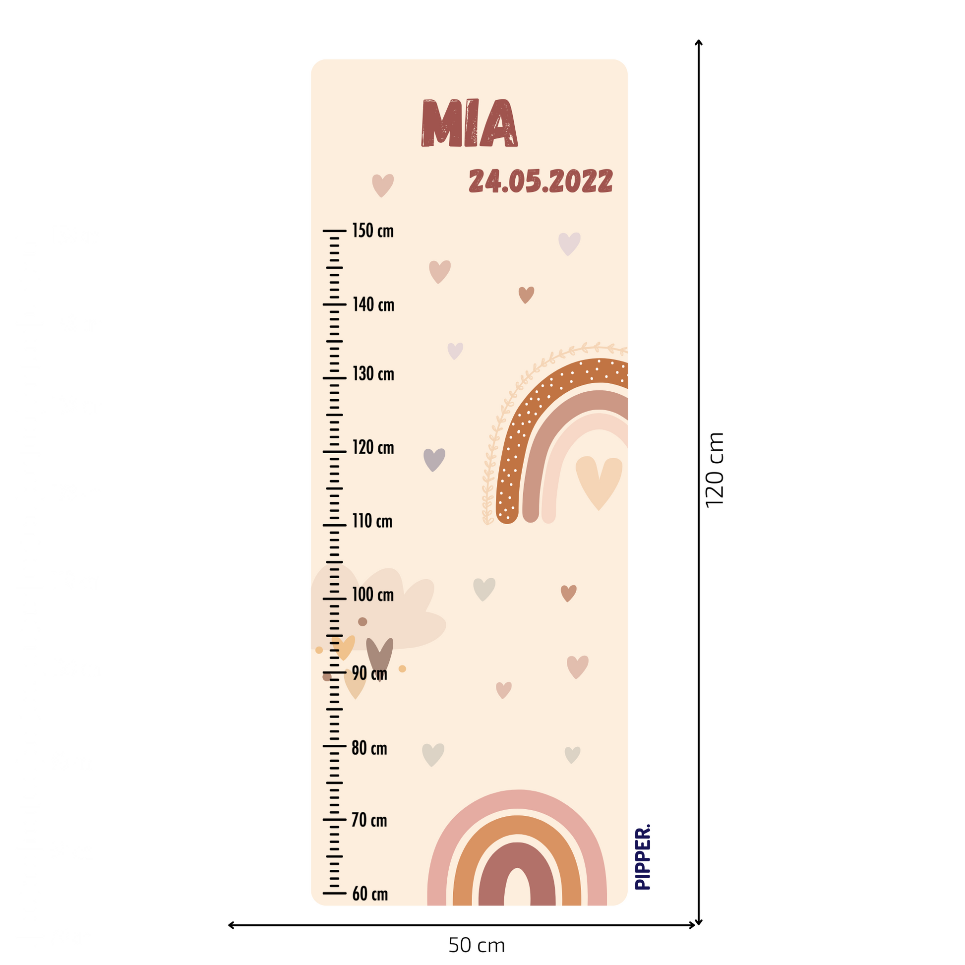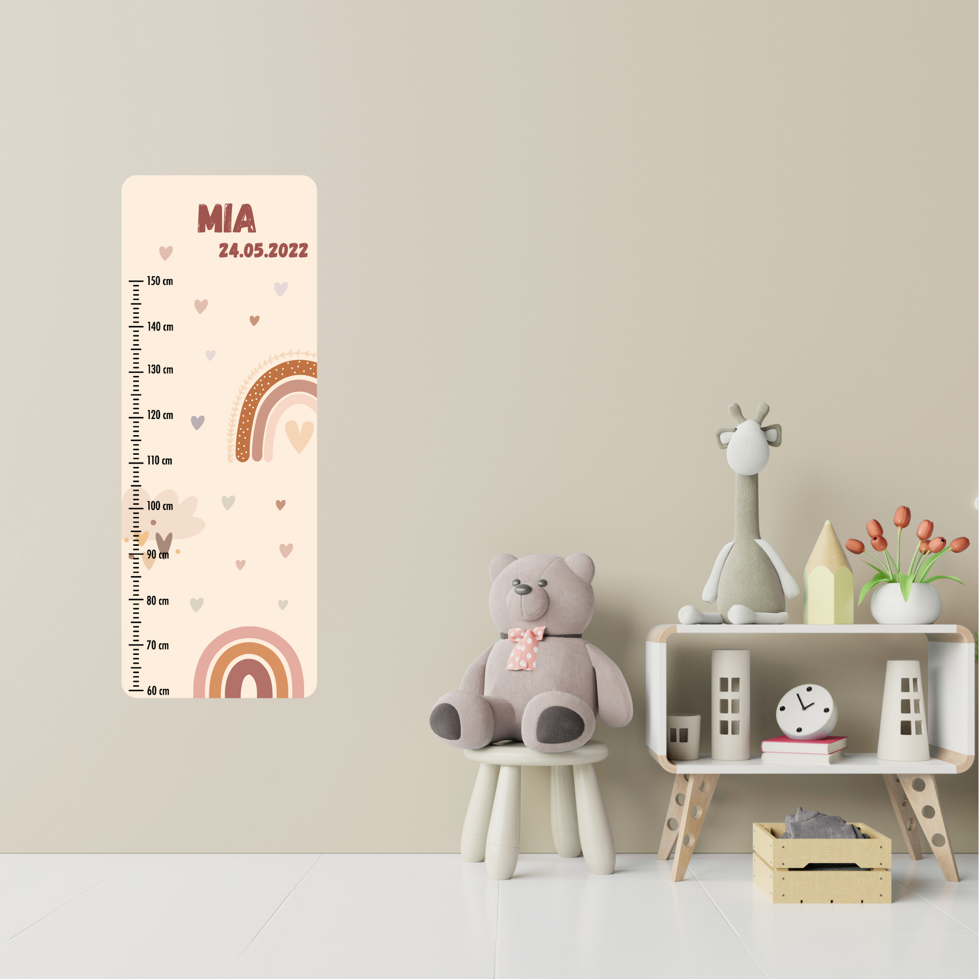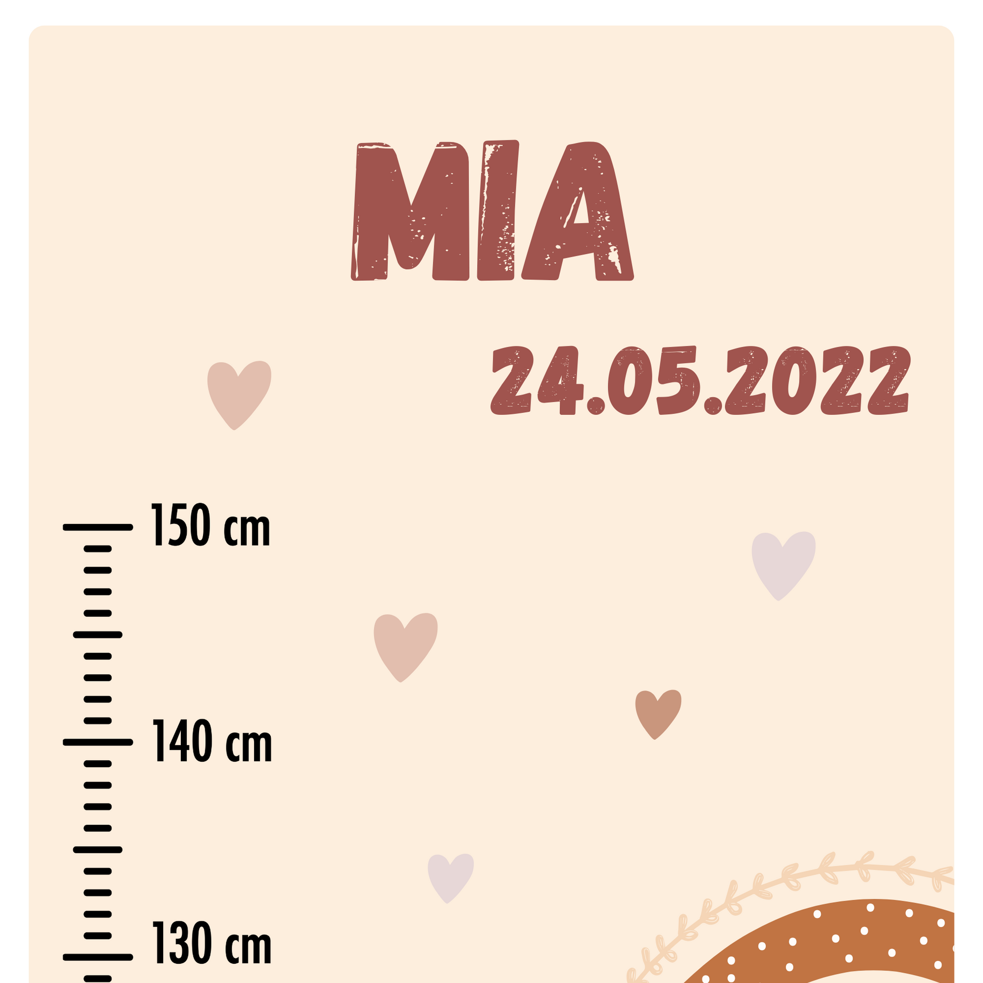 This gentle textile wall sticker in earthy tones, personalized with your child’s name and date of birth, is the perfect addition to any nursery. It tracks height from 60 cm to 150 cm and, with its delicate design of hearts and rainbows, brings a sense of calm, warmth, and love into the space.