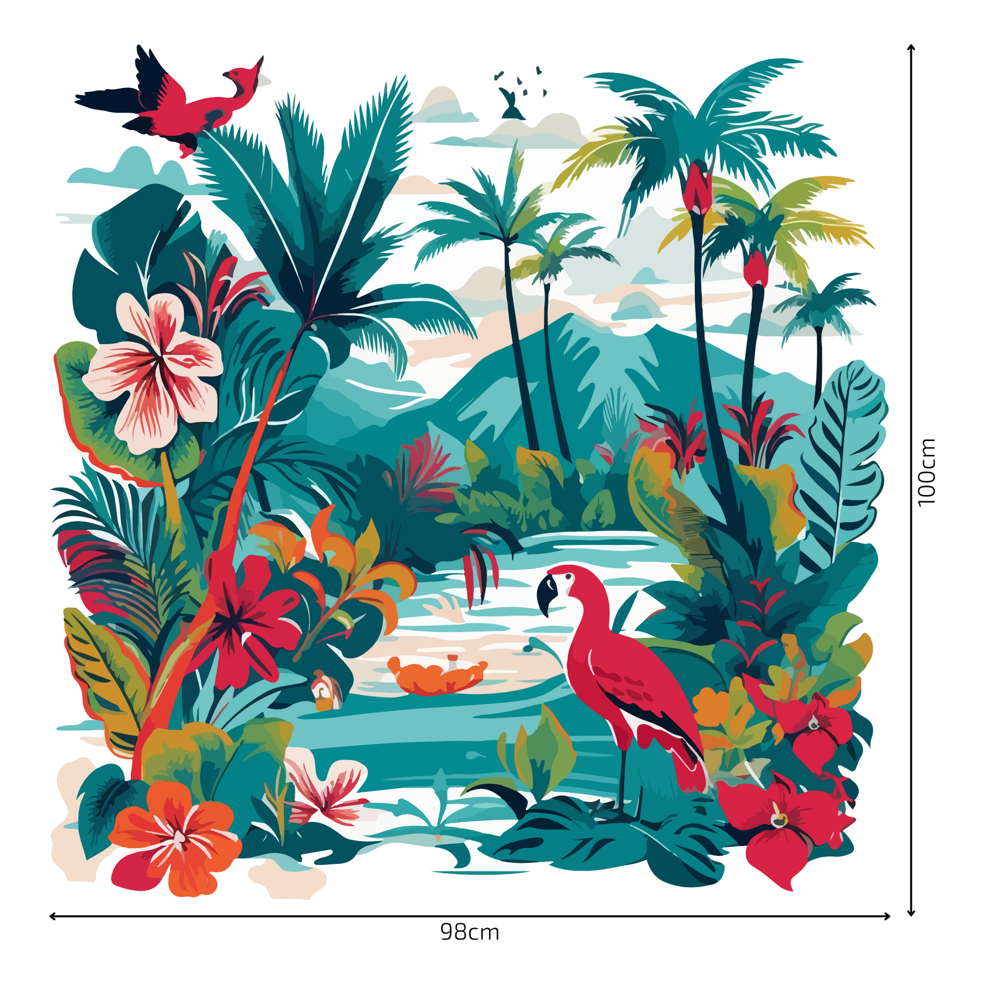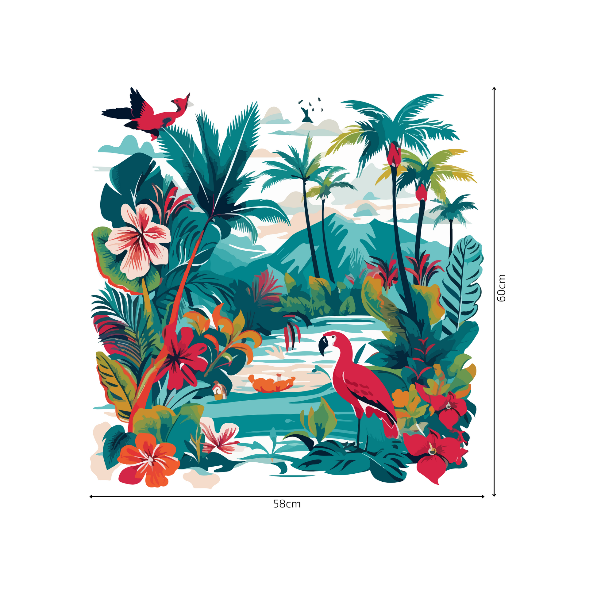 Welcome to a vivid paradise with our Round Wall Sticker – “Colorful Jungle”! Dive into a lush world full of vibrant flowers, tall palms, playful birds, and calm jungle waters. Every detail bursts with tropical energy and playful charm. 🌴🌸🌞