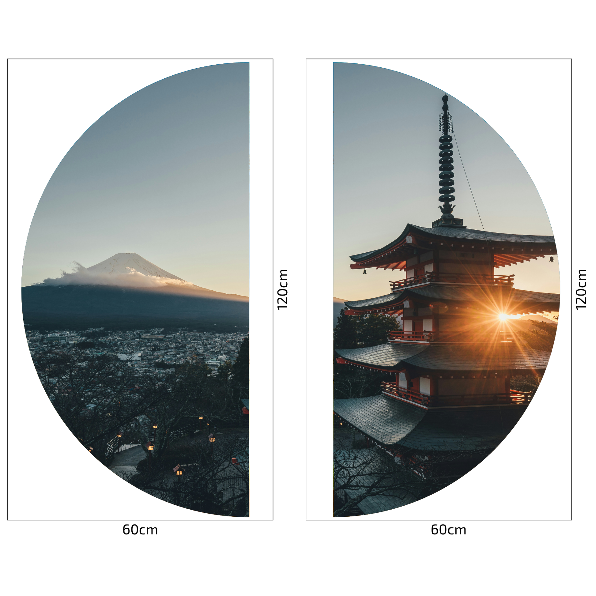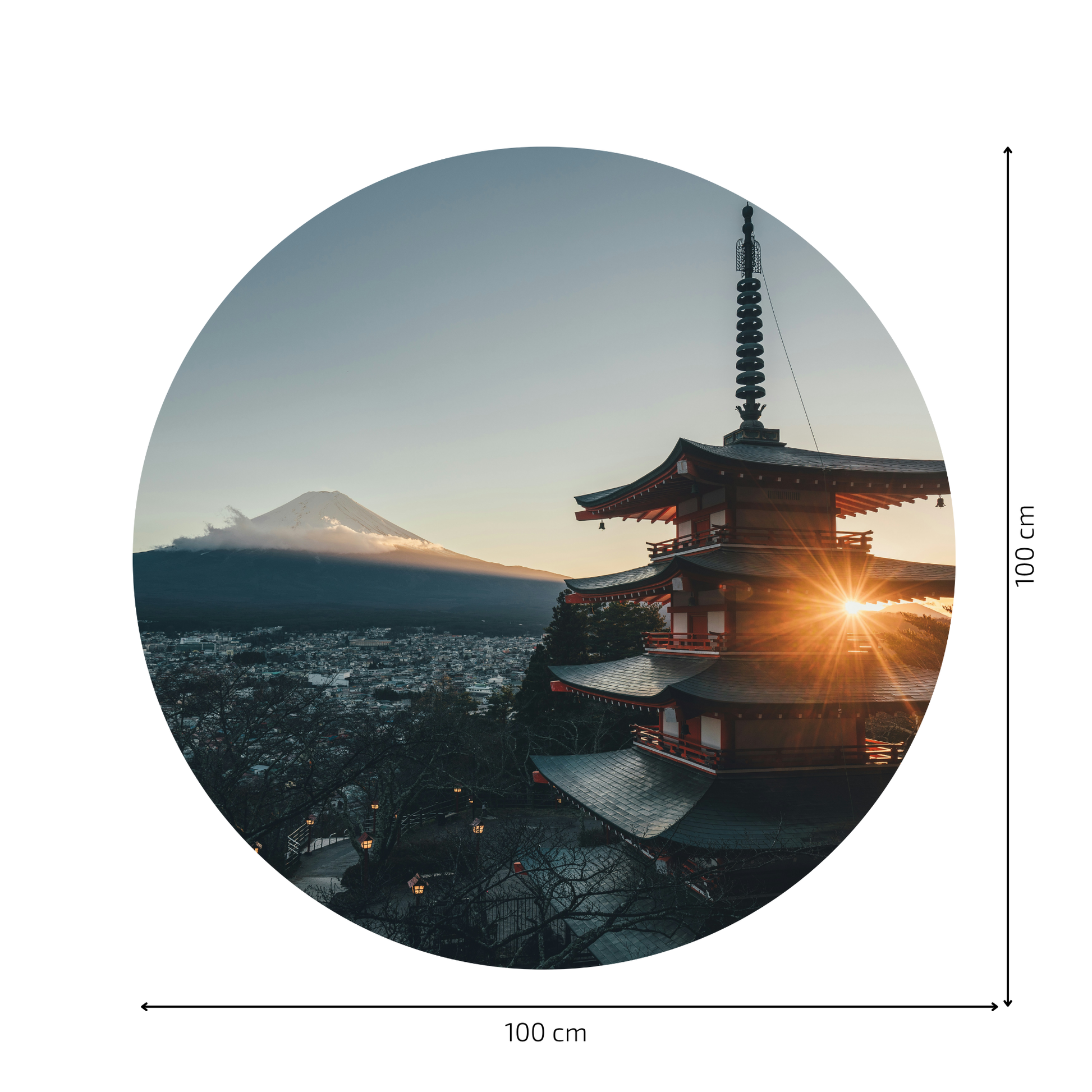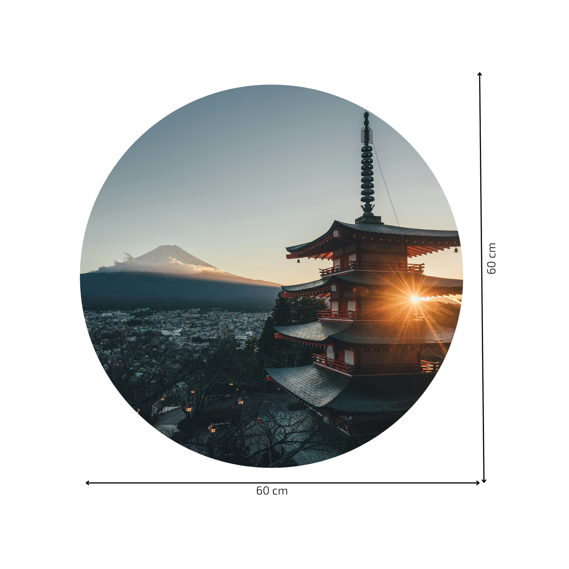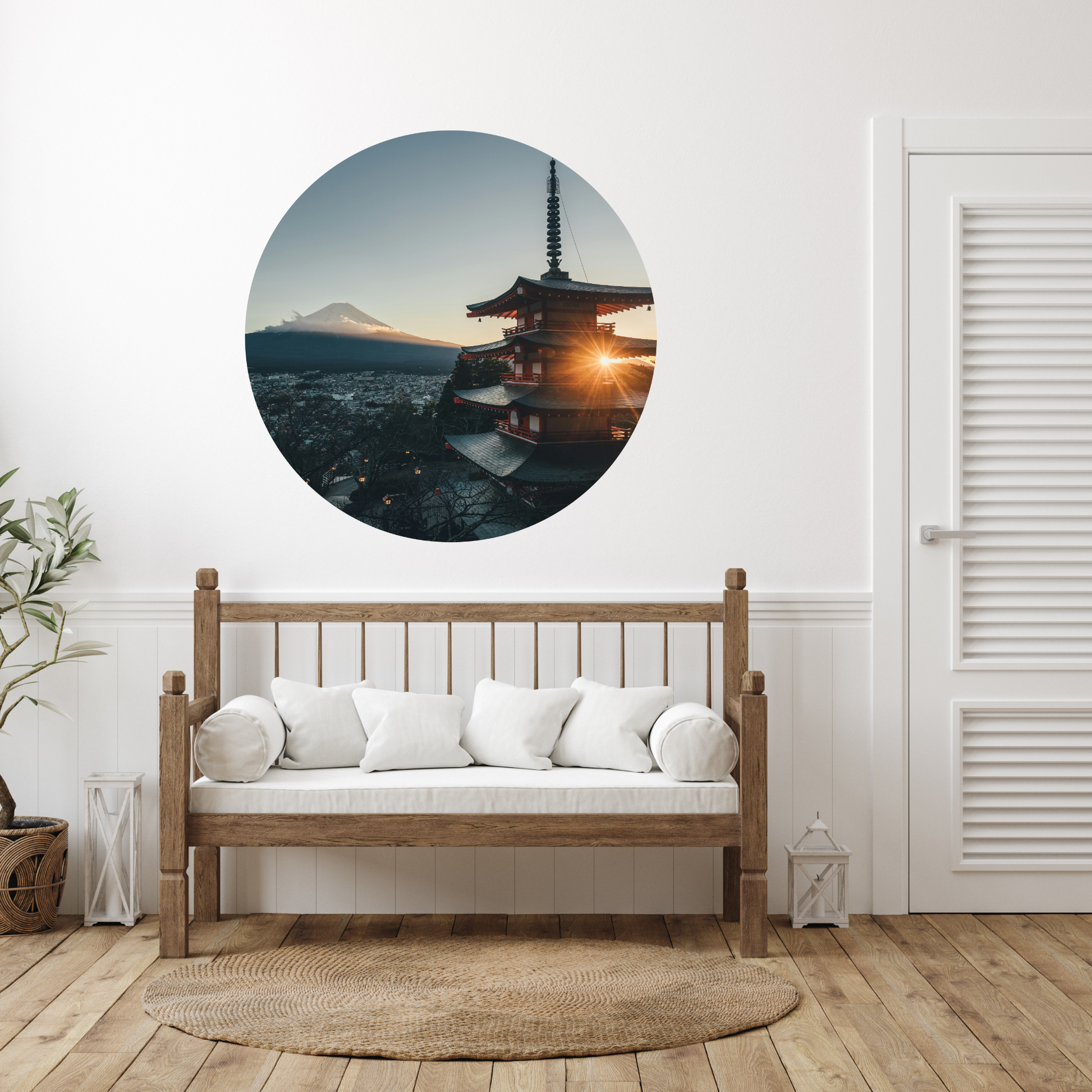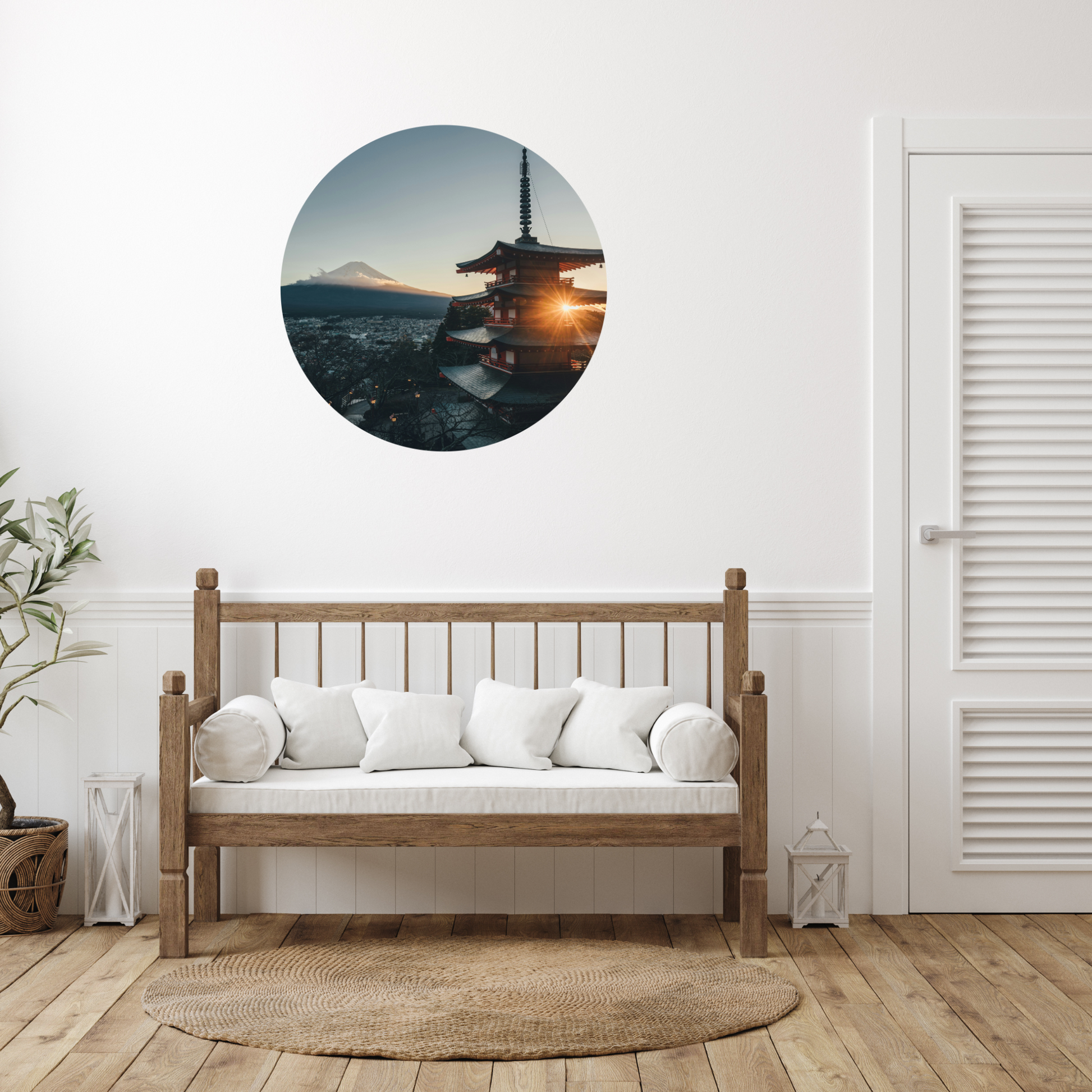 The Round Wall Sticker – “Japan 2” blends the beauty of nature with delicate architecture, where the setting sun glows between the rooftops of a shrine, creating a serene and harmonious atmosphere. This visual transports you to a land where silence tells stories and every detail holds meaning.