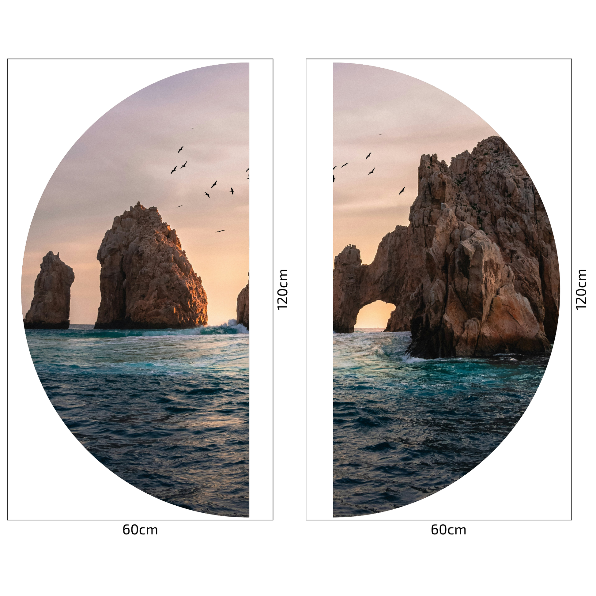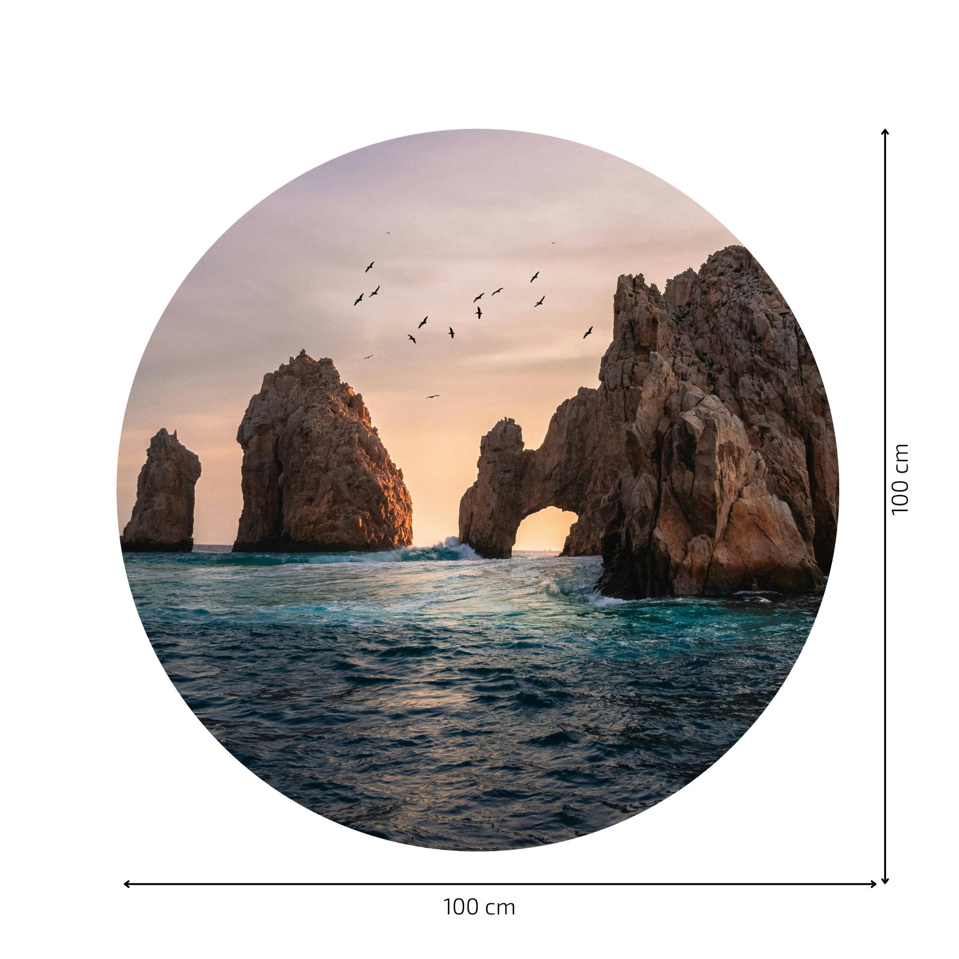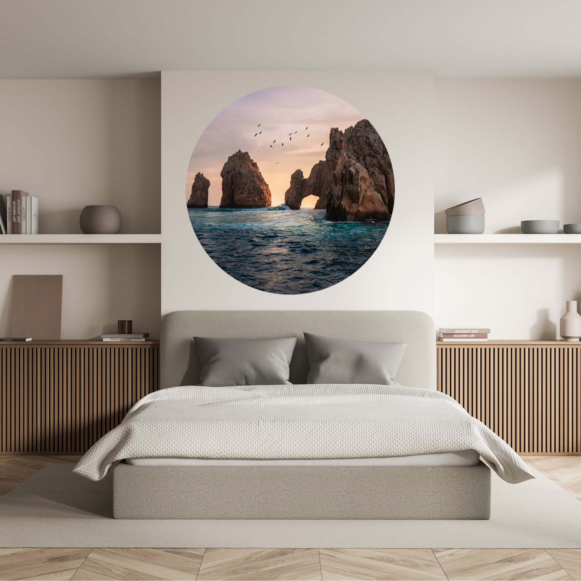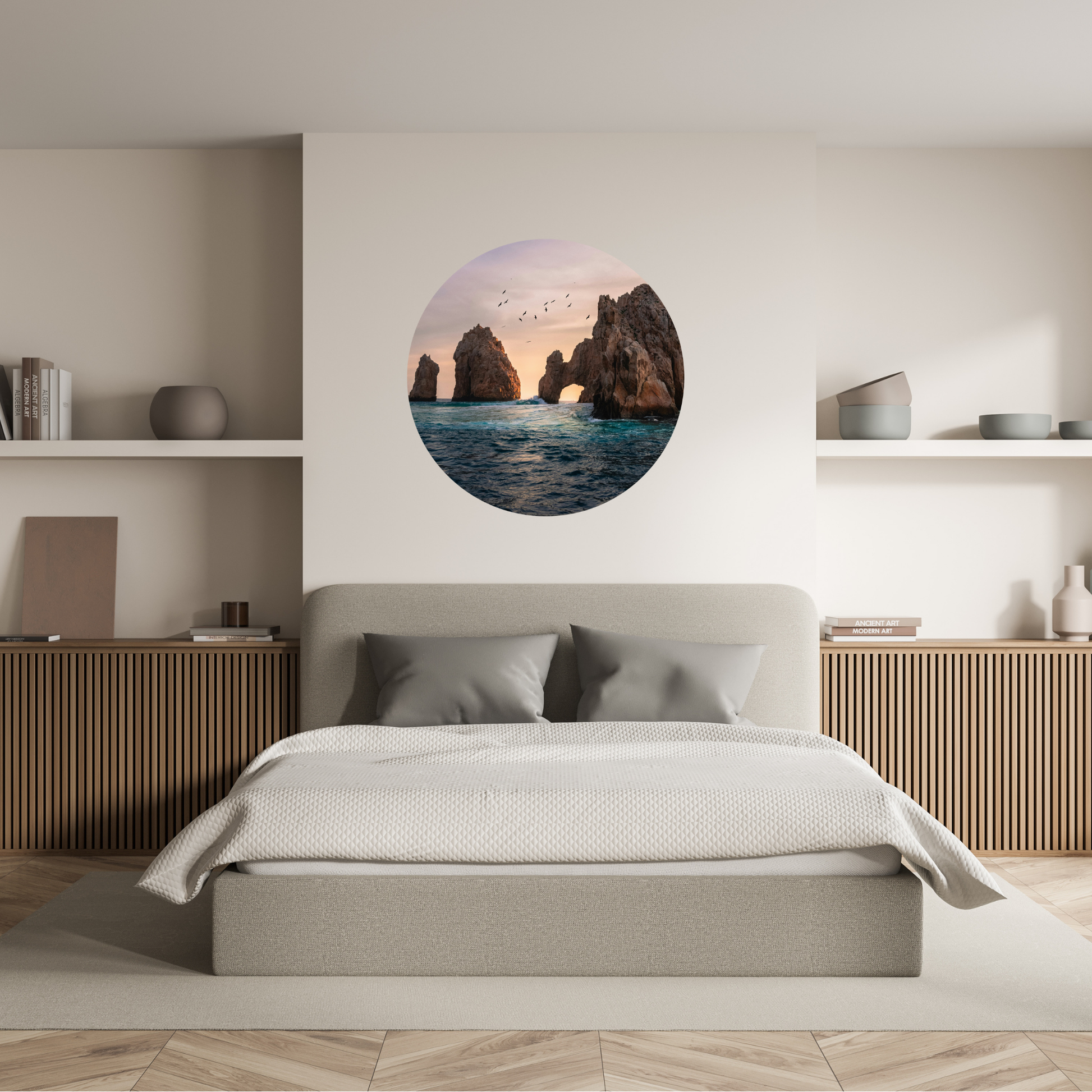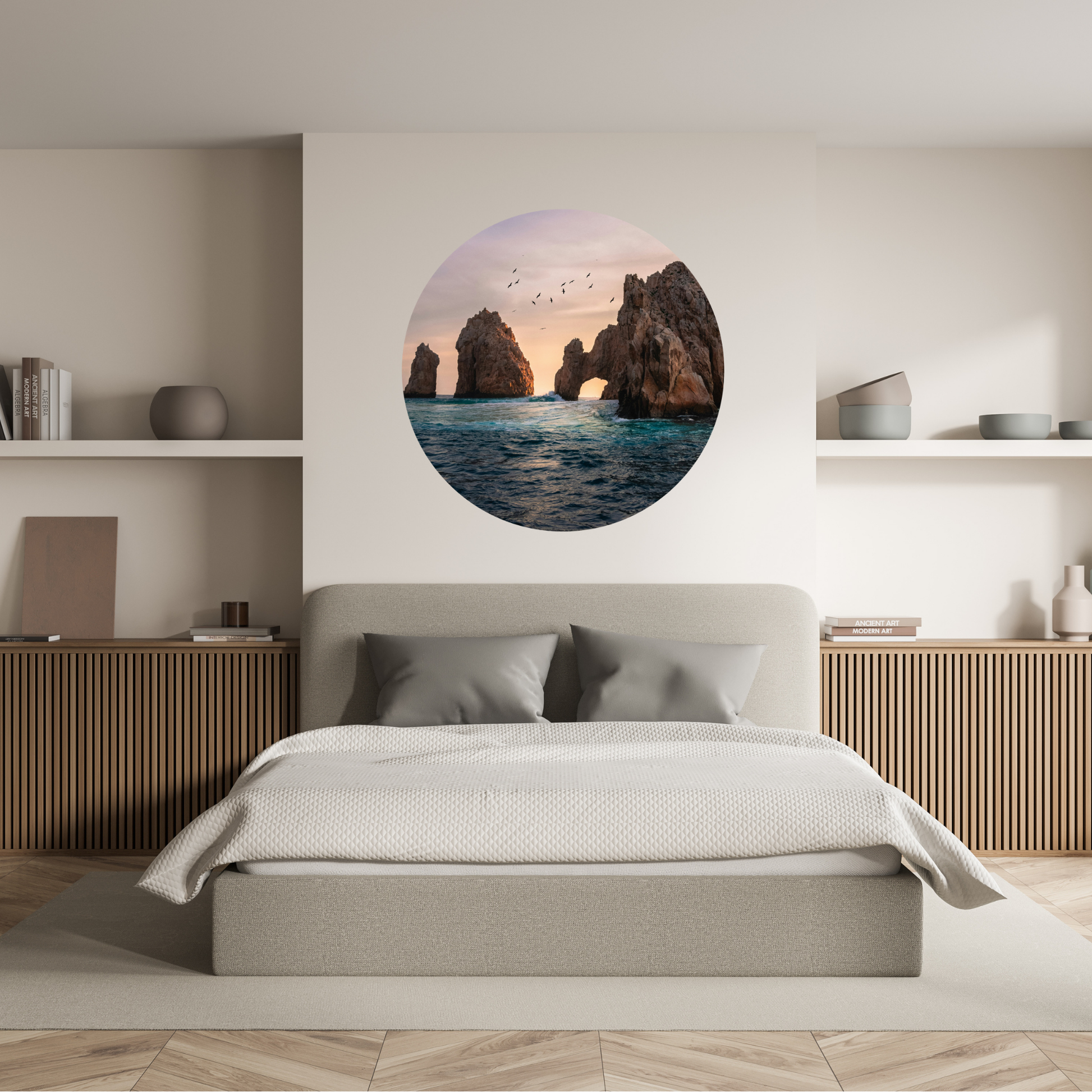 The Round Wall Sticker – “Los Cabos” captures the majestic El Arco arch bathed in the golden glow of sunset. Waves crashing against the rocks and birds soaring above the ocean bring a sense of freedom, adventure, and endless horizons into your space. Perfect for those who love the sea, travel, and unforgettable moments frozen in time.