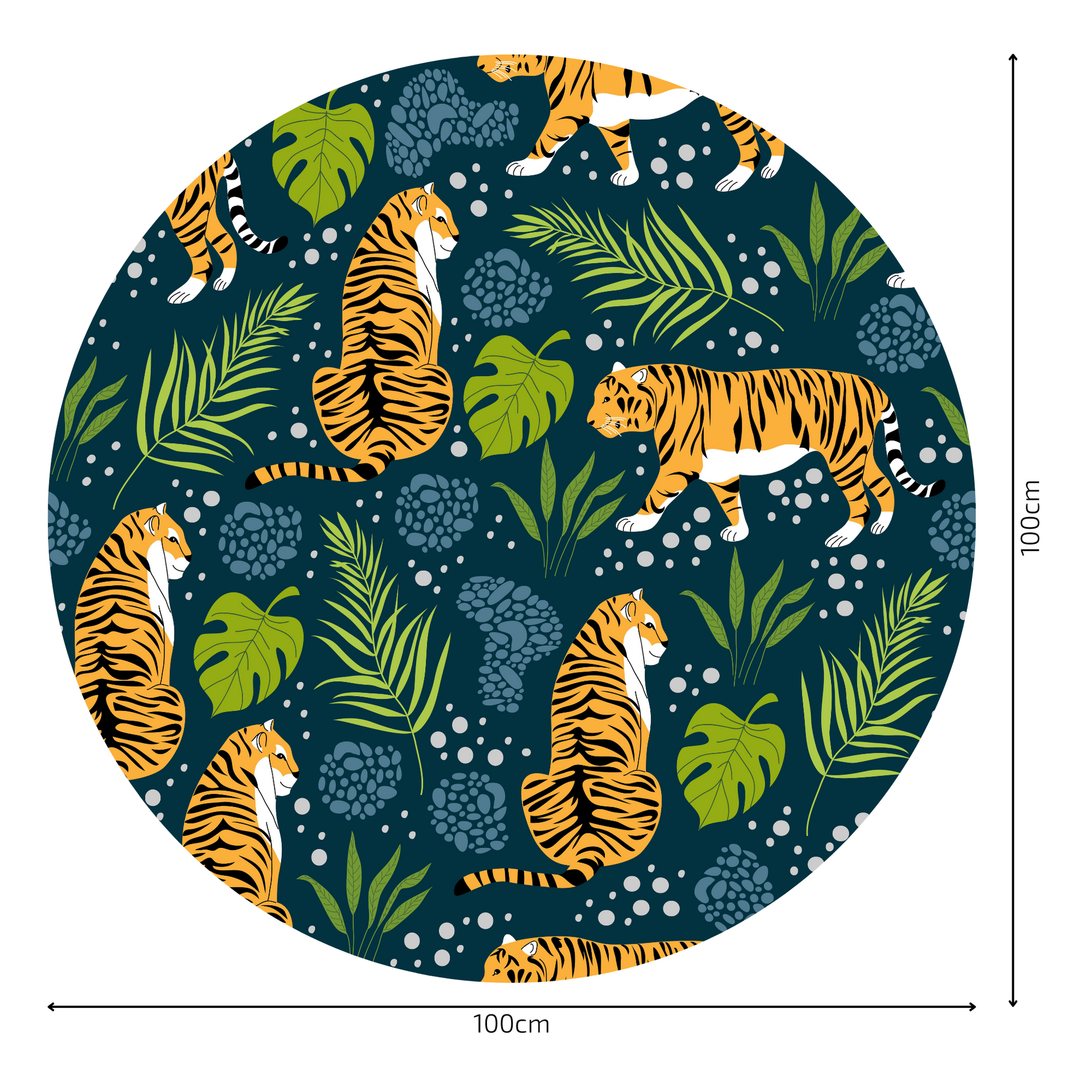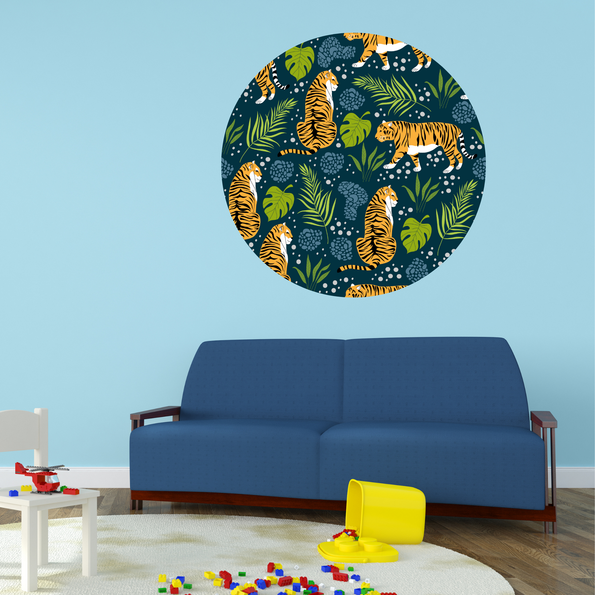 Step into the mysterious heart of the jungle with our Round Wall Sticker – “Tigers in the Jungle”! This vibrant pattern full of majestic tigers, lush tropical leaves, and playful jungle textures brings a bold, untamed energy to any room.