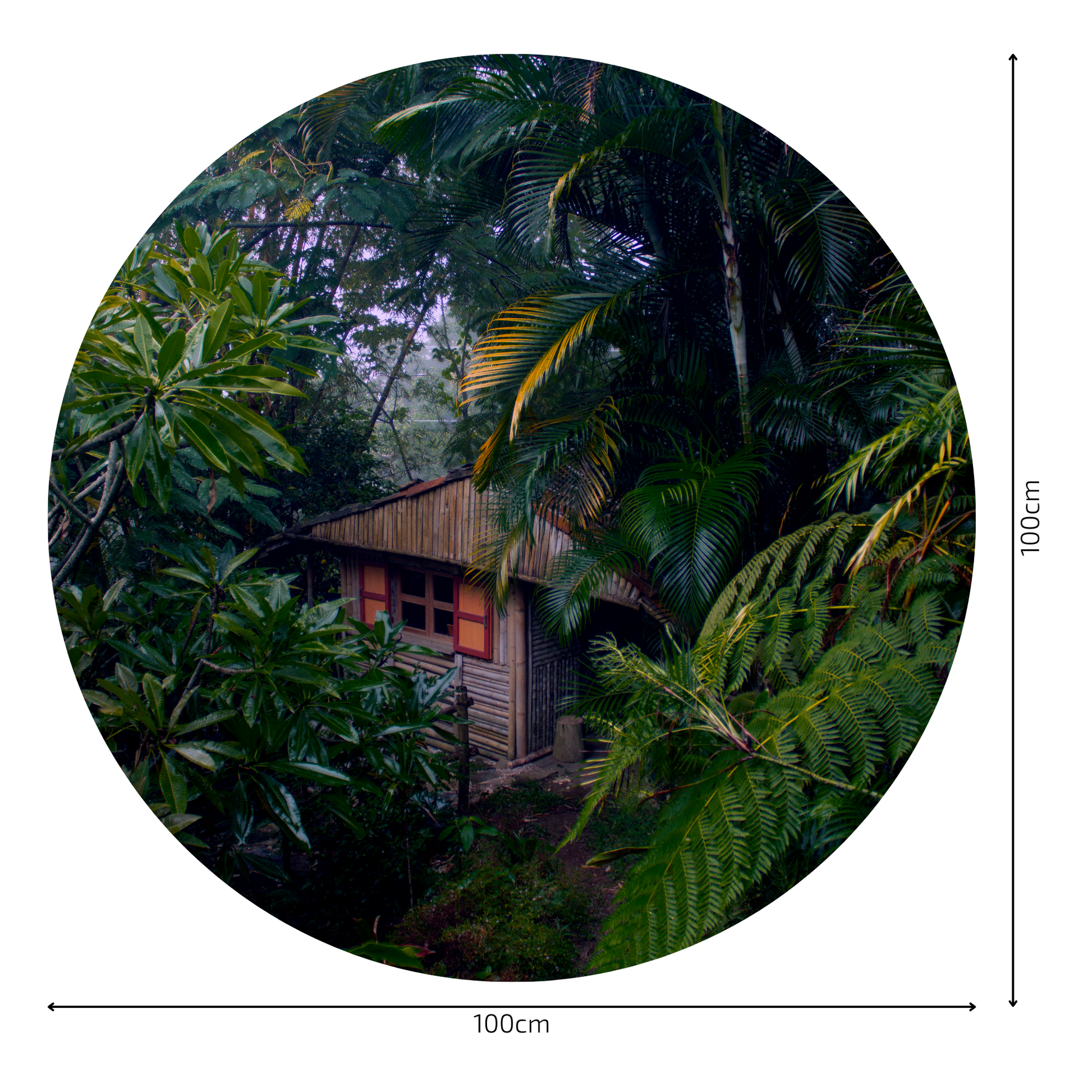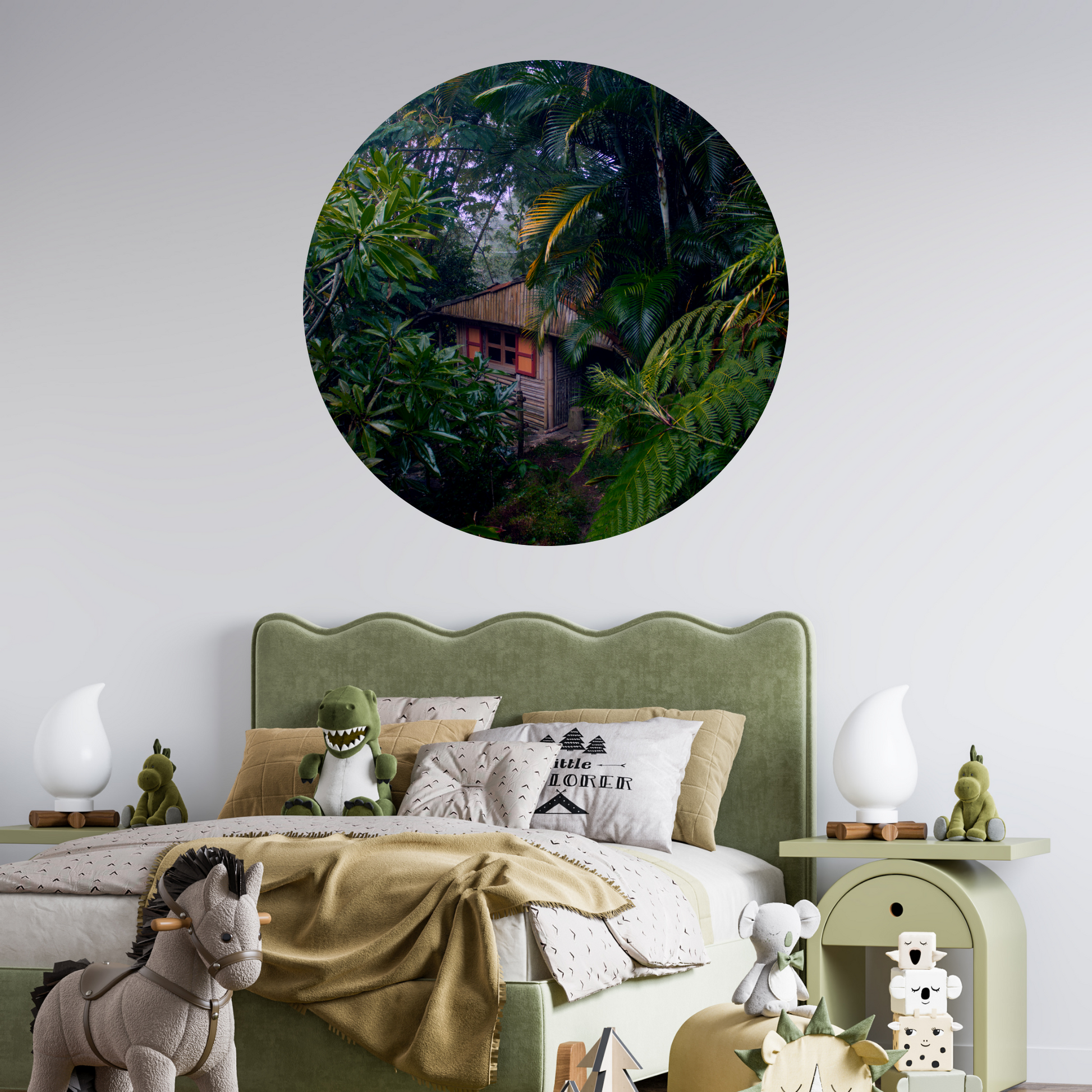 Escape into the heart of the jungle with our Round Wall Sticker – “Treehouse in the Jungle”! Tucked away among lush tropical leaves, this peaceful wooden hideaway sparks the imagination and invites stories of adventure, calm, and discovery.
