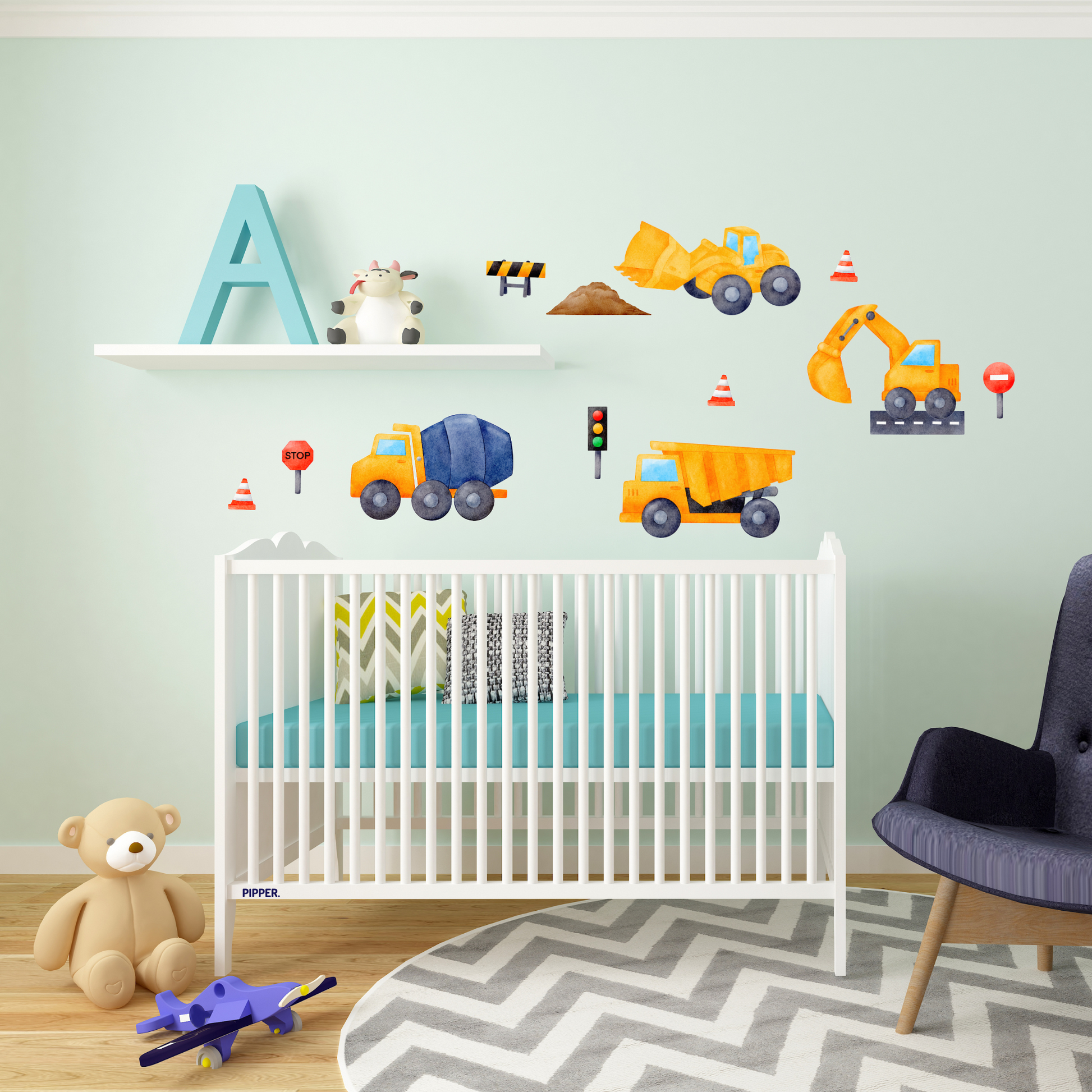 Our Construction Trucks textile wall sticker brings the excitement of the construction site right into your child’s room. With colorful dump trucks, excavators, cement mixers, road signs, and cones, this set is perfect for kids who love big machines and hands-on fun.