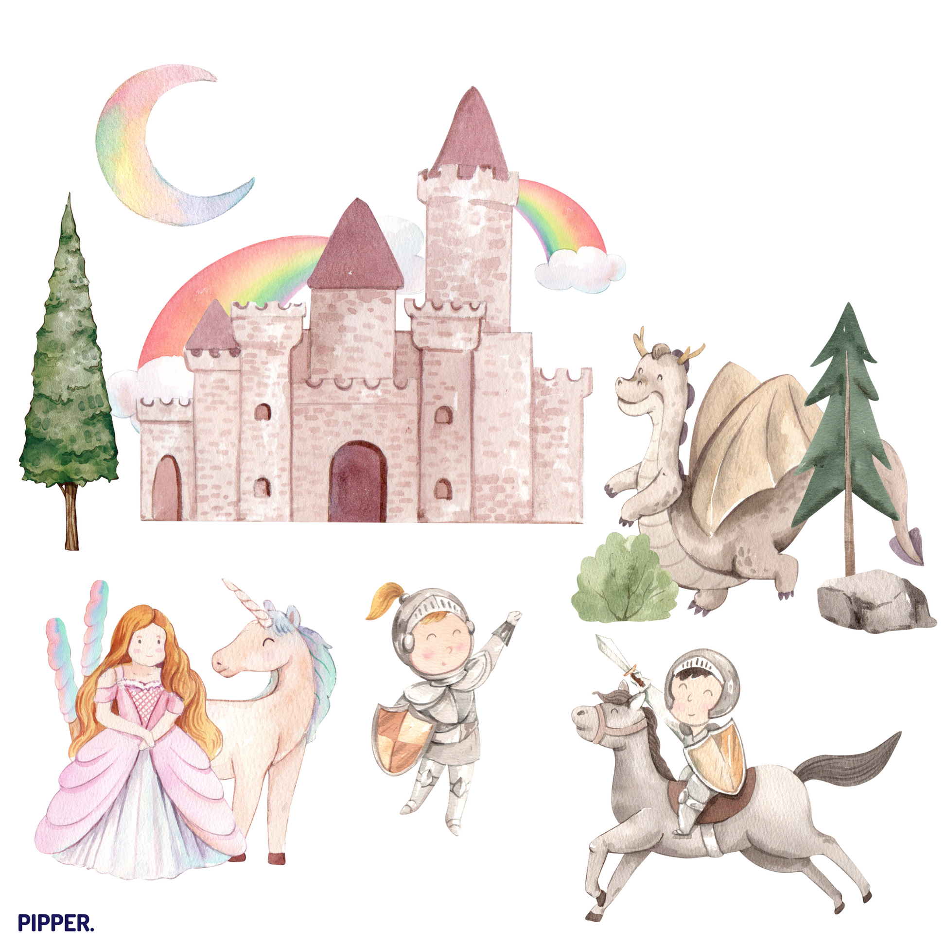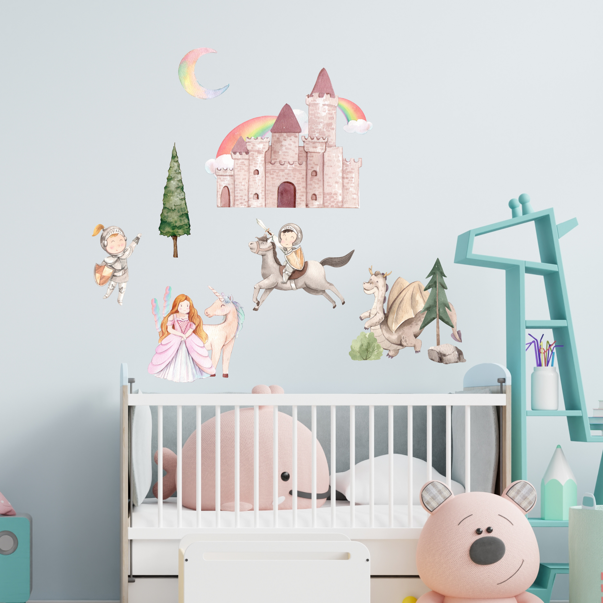 Step into a magical kingdom with our Fairytale Land Textile Wall Sticker! ✨ Featuring a dreamy pink castle, brave knights, a graceful princess, a gentle unicorn, and even a friendly dragon - this set turns any wall into a storybook adventure.