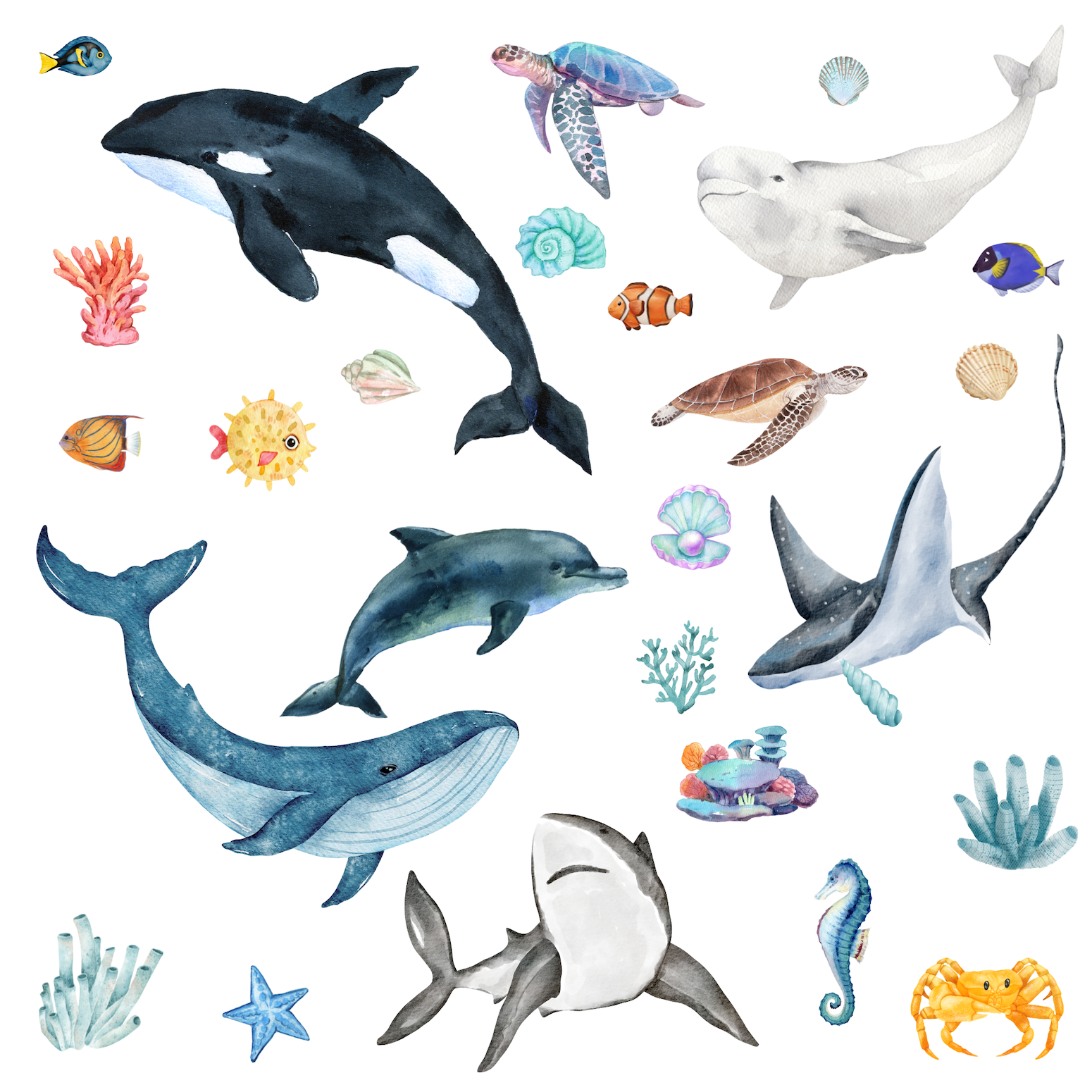 Make a splash in your child’s room with our Textile Wall Sticker XXL – Underwater World! Dive into a magical sea full of watercolor whales, dolphins, sharks, turtles, coral reefs, and colorful fish - all beautifully illustrated to bring the ocean to life.