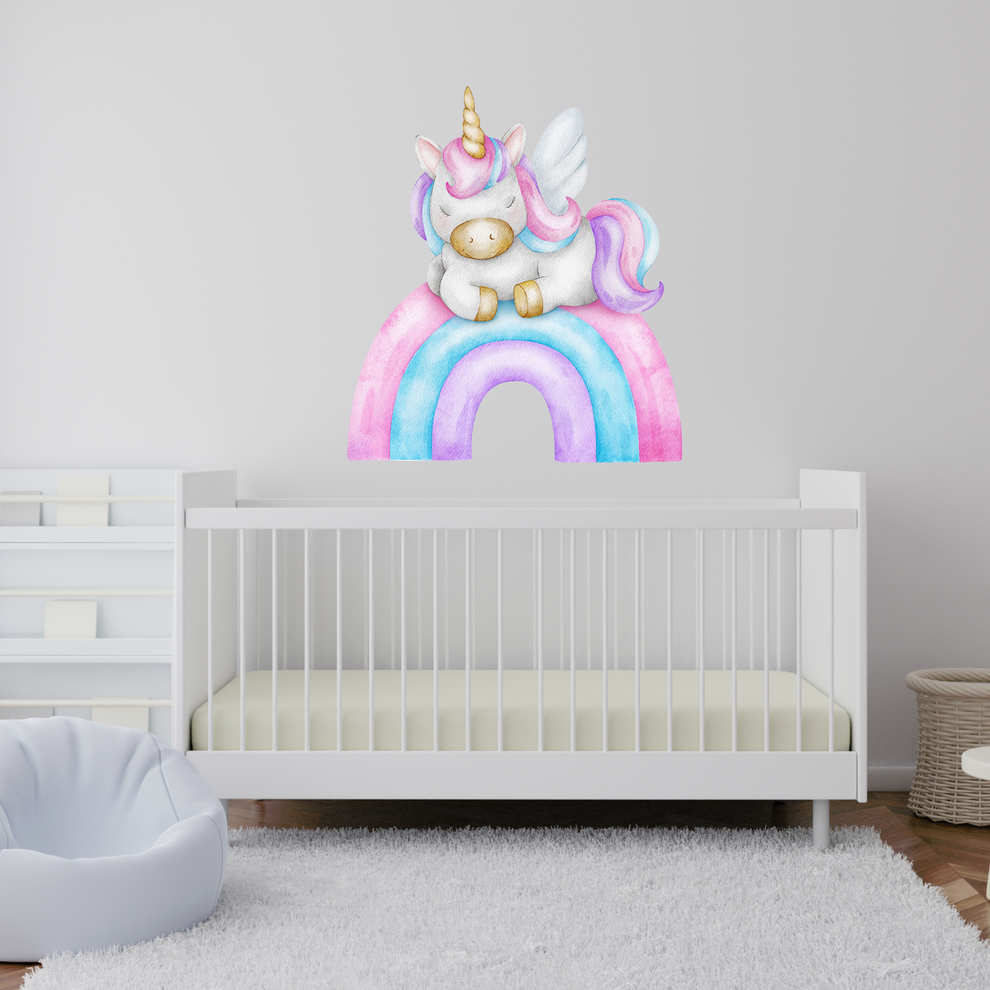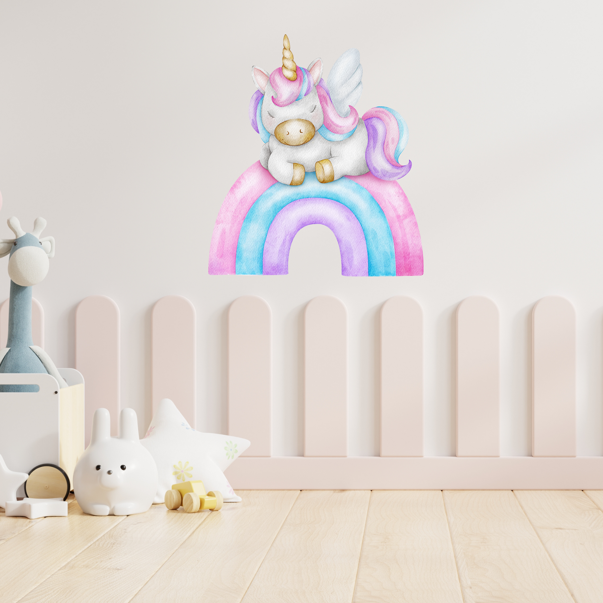 Let your imagination take flight with our Textile Wall Sticker – "Unicorn on a Rainbow"! This charming design features a sweet, sleeping unicorn resting on a pastel rainbow – a magical scene that brings joy, colour, and a touch of whimsy to any room.