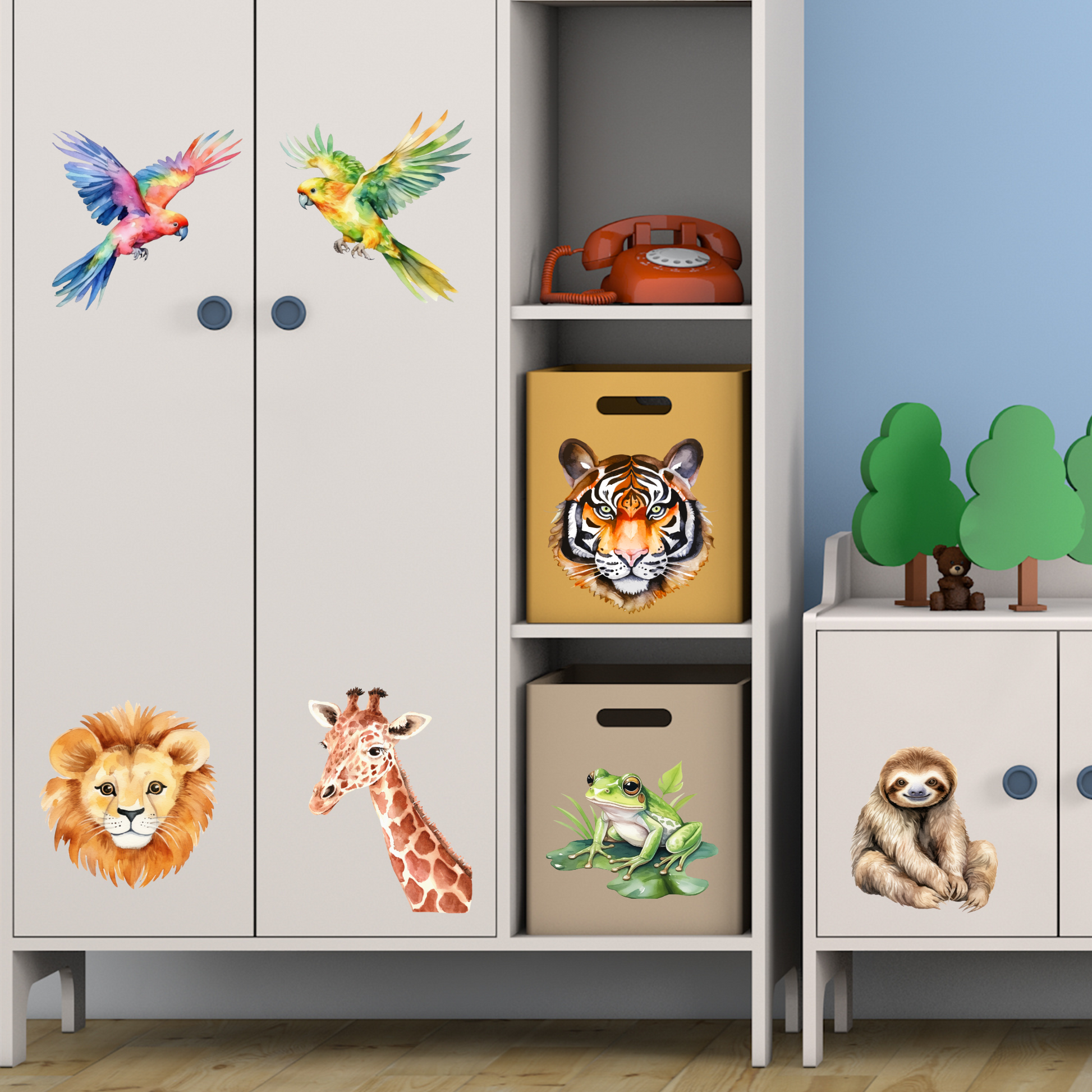 Bring the wild wonders of nature into your child’s room with our Watercolor Animals textile sticker! 🎨🦁 This lovely set features beautifully painted animals like a lion, tiger, giraffe, frog, sloth, and vibrant parrots – all in soft watercolor style that’s full of personality and charm.